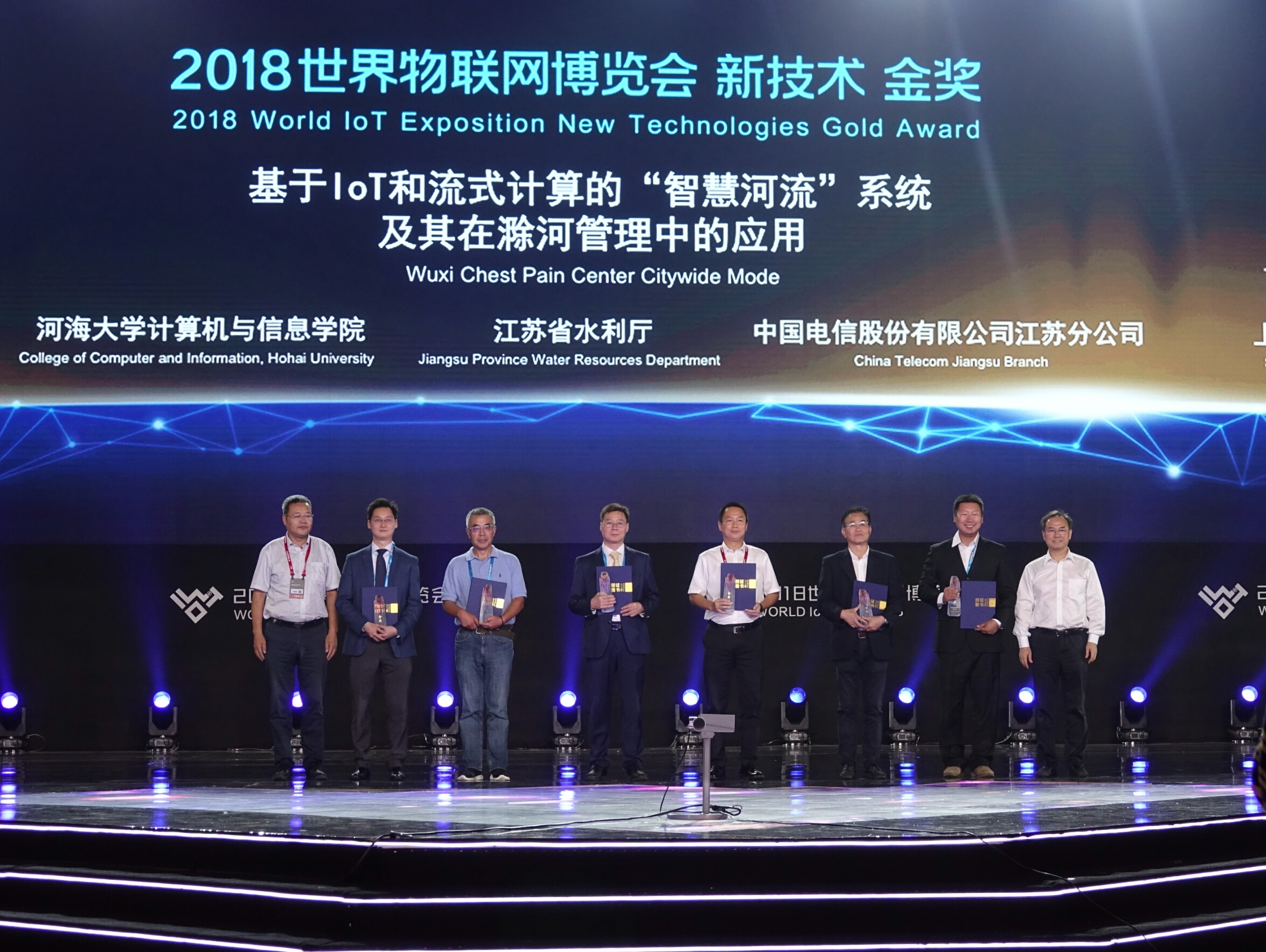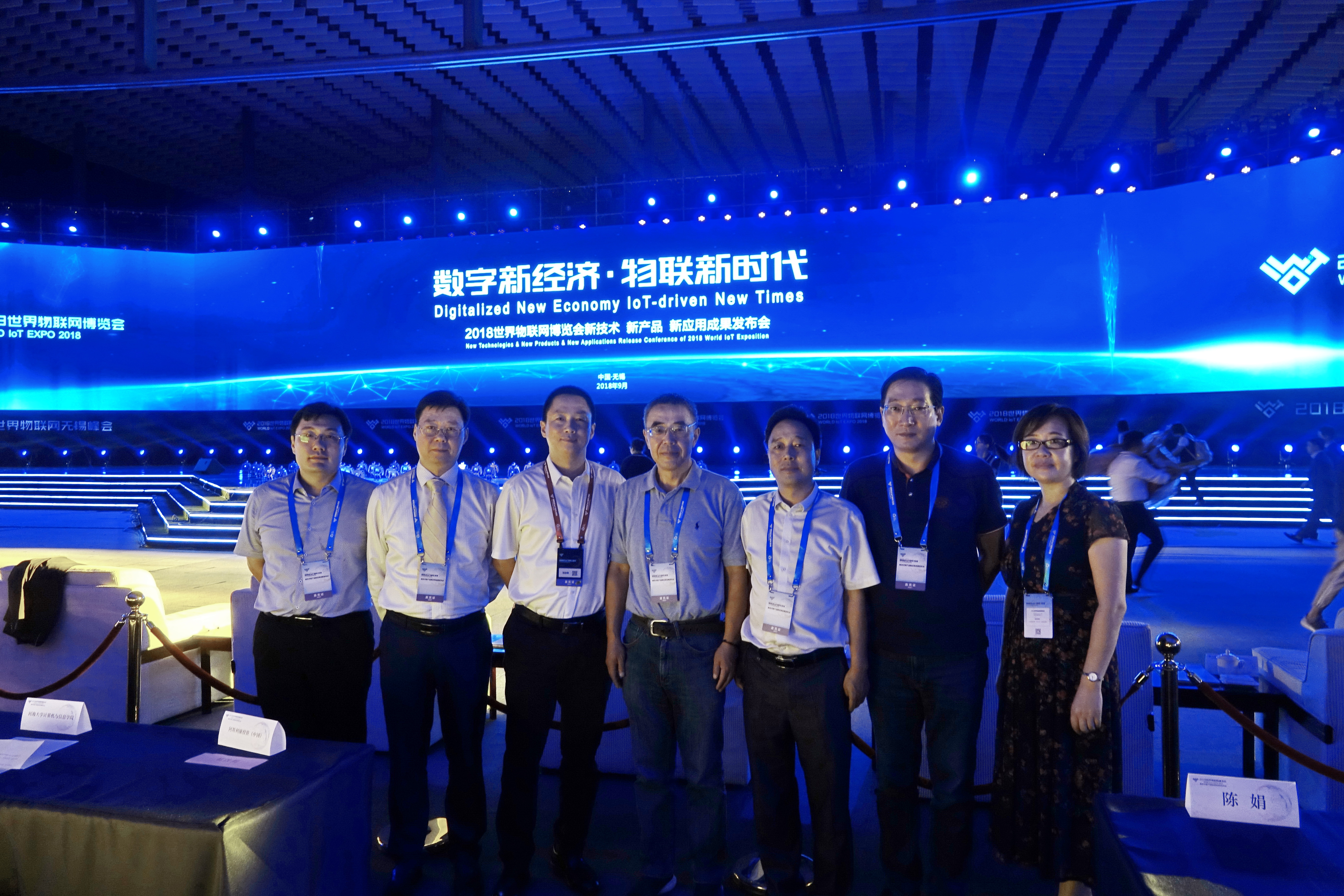 9月15日,2018世界物联网博览会新技术新产品新应用成果发布会在无锡举行。以黄色直播 计算机与信息学院为主,联合江苏省水利厅、中国电信江苏公司研发并申报的“基于IoT和流式计算的‘智慧河流’系统”,获得大会金奖,并获得由多位院士组成的专家委员会的高度评价。王志坚教授代表整个项目团队领取了金奖奖杯和证书,学院领导张雪刚书记、叶保留院长作为获奖单位嘉宾也受邀参加了本次盛会。