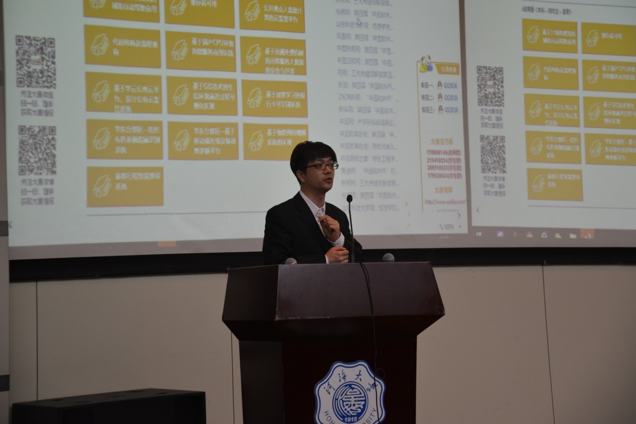 会上,胡鹤轩教授代表学院向与会的专家、代表表示了热烈的欢迎,并介绍我校师生在历届大赛中的参与获奖情况。我校从大赛的前身“江苏软件杯”开始参加此项赛事,取得了优异的成绩。通过参加大赛,学生们磨练了专业技能、提高了动手实践能力。