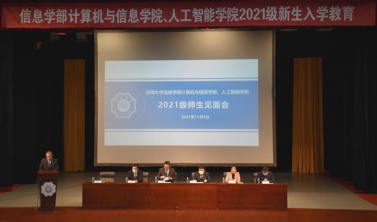 2021年11月3日,信息学部计算机与信息学院、人工智能学院2021级师生见面会在江宁文体中心小剧场隆重召开。信息学部部长、人工智能学院院长叶保留,信息学部党委书记王志峰,计算机与信息学院副院长(主持工作)胡鹤轩,计算机与信息学院副院长毛莺池,人工智能学院副院长刘凡出席见面会。各系主任、2021级本科生班导师、教学秘书、全体辅导员与2021级本硕博700余位同学参加了见面会。信息学部党委副书记刘春田主持见面会。