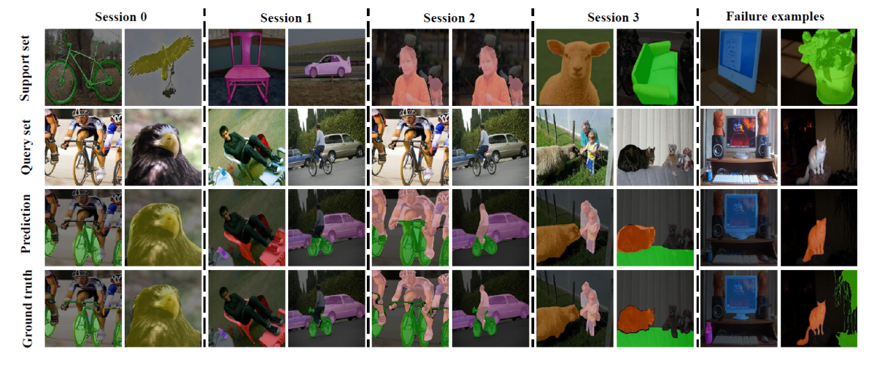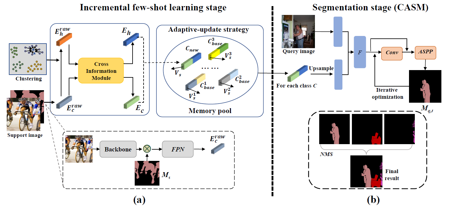 该论文聚焦增量小样本条件下的图像语义分割问题,通过增量地学习不同类别的语义知识,在获得对新类图像像素级分割能力的同时,保持对旧类的分割能力。论文分析了在增量小样本学习模型中,易出现的旧类遗忘和新类过拟合问题。为此,论文提出了一种基于嵌入表示自适应更新和超类表示策略的深度神经网络模型(EHNet),前项策略用于避免旧类的特征漂移,解决旧类遗忘问题,后者基于已学习类别的语义知识,为新类别的超类嵌入表示提供构建指导,减轻对训练数据规模的依赖。与最优方法(PIFS)相比,EHNet在基准测试数据集上获得5.9个百分点的性能提升,是增量小样本图像语义分割的当前最佳方法。
