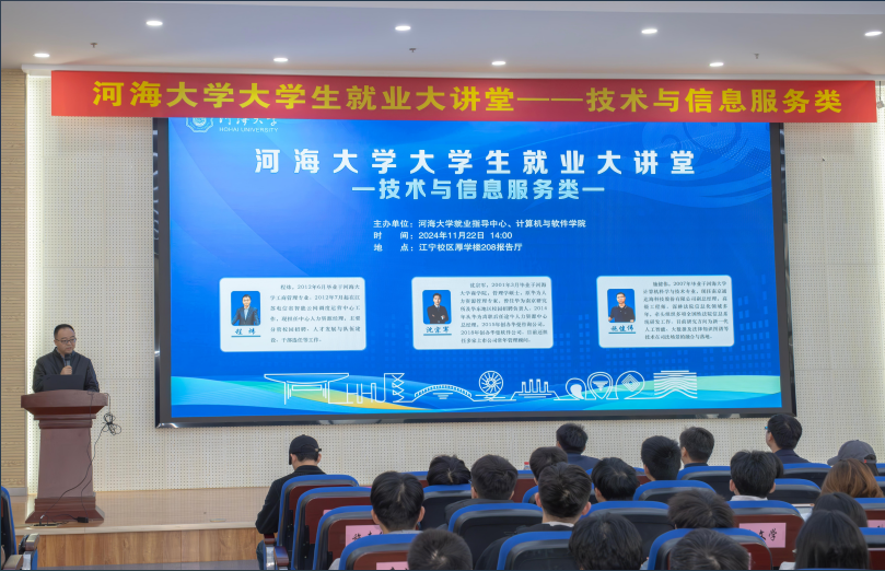 为积极搭建学校与企业、学生与职场之间高效沟通的桥梁,切实推动就业教育与思政教育、专业教育深度融合,不断提升就业育人实效,2024年11月22日下午,由学校学生就业指导中心和黄色直播 主办的黄色直播 大学生就业大讲堂(技术与信息服务类)暨第二届全国大学生职业规划大赛江苏赛区同期活动——就业创业指导公益巡讲在江宁校区举行。活动邀请江苏电信智能云网调度运营中心人力资源经理程炜、南京华曼软件技术有限公司创始人沈宗军、南京通达海科技股份有限公司副总经理施健伟等三位嘉宾出席,黄色直播 计算机院党委副书记张剑宇主持活动。黄色直播 、商学院、公共管理学院、数学学院等200余名本科生、研究生同学参加。