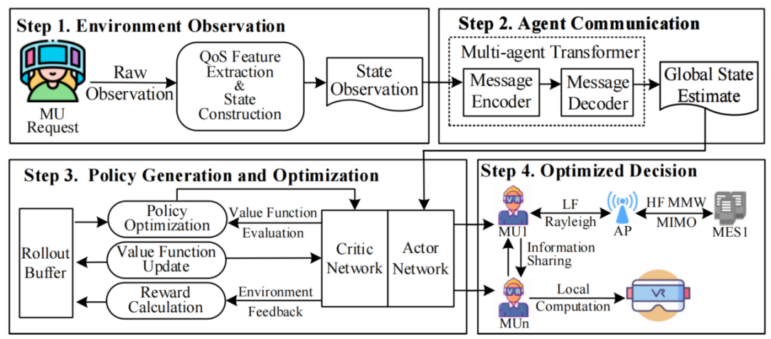 针对现有方法在专用无线信道刻画不足、强交互场景下多维服务质量协同优化能力有限,以及部分可观测条件下决策稳定性不佳等问题,研究团队提出了一种面向元宇宙应用的交互感知快速计算卸载与资源分配联合优化方法——MetaTMCO,为复杂动态环境下提升系统性能与用户体验提供了新的解决思路。MetaTMCO从无线信道建模、交互特征刻画和联合决策优化三个层面进行系统设计。首先,构建融合低频Rayleigh衰落与高频毫米波MIMO的混合无线传输模型,以描述头部运动、高移动性切换和多跳前传等因素引起的时变信道特性,提升对复杂元宇宙通信环境中链路动态变化的刻画能力。其次,引入交互频率指标,将社交关系、任务相似性、场景切换和帧率等因素统一纳入建模,量化强交互场景下的用户资源竞争关系,并结合时延、吞吐率和丢包率构建多服务质量效用模型,实现多维性能目标的协同权衡。最后,设计Transformer增强的MAPPO协同决策框架,联合输出计算卸载决策与资源分配结果,在满足边缘服务器容量约束的同时,提升复杂元宇宙环境下在线决策的稳定性、协调性与资源利用效率。